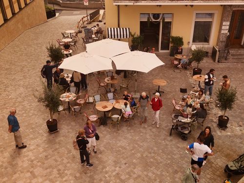 Geniesse herbstliche Sonnenstrahlen auf unserer Pflasterstein-Terrasse, umgeben von weichen Farben, grünen Pflanzen und gemütlichen Sonnenschirmen. Der perfekte Ort zum Entspannen, Kaffee trinken oder Leute beobachten.