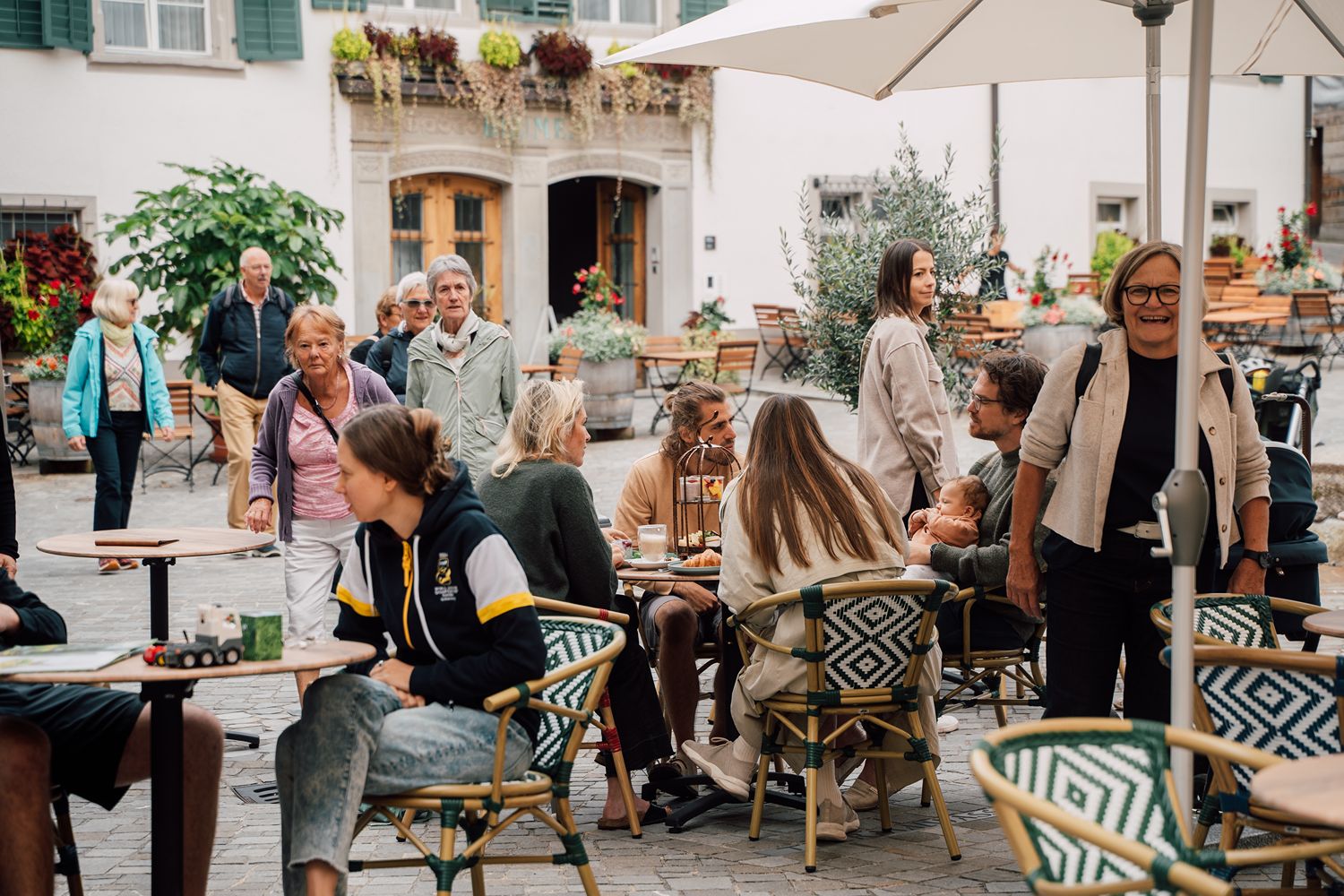 Geniesse herbstliche Sonnenstrahlen auf unserer Pflasterstein-Terrasse, umgeben von weichen Farben, grünen Pflanzen und gemütlichen Sonnenschirmen. Der perfekte Ort zum Entspannen, Kaffee trinken oder Leute beobachten.